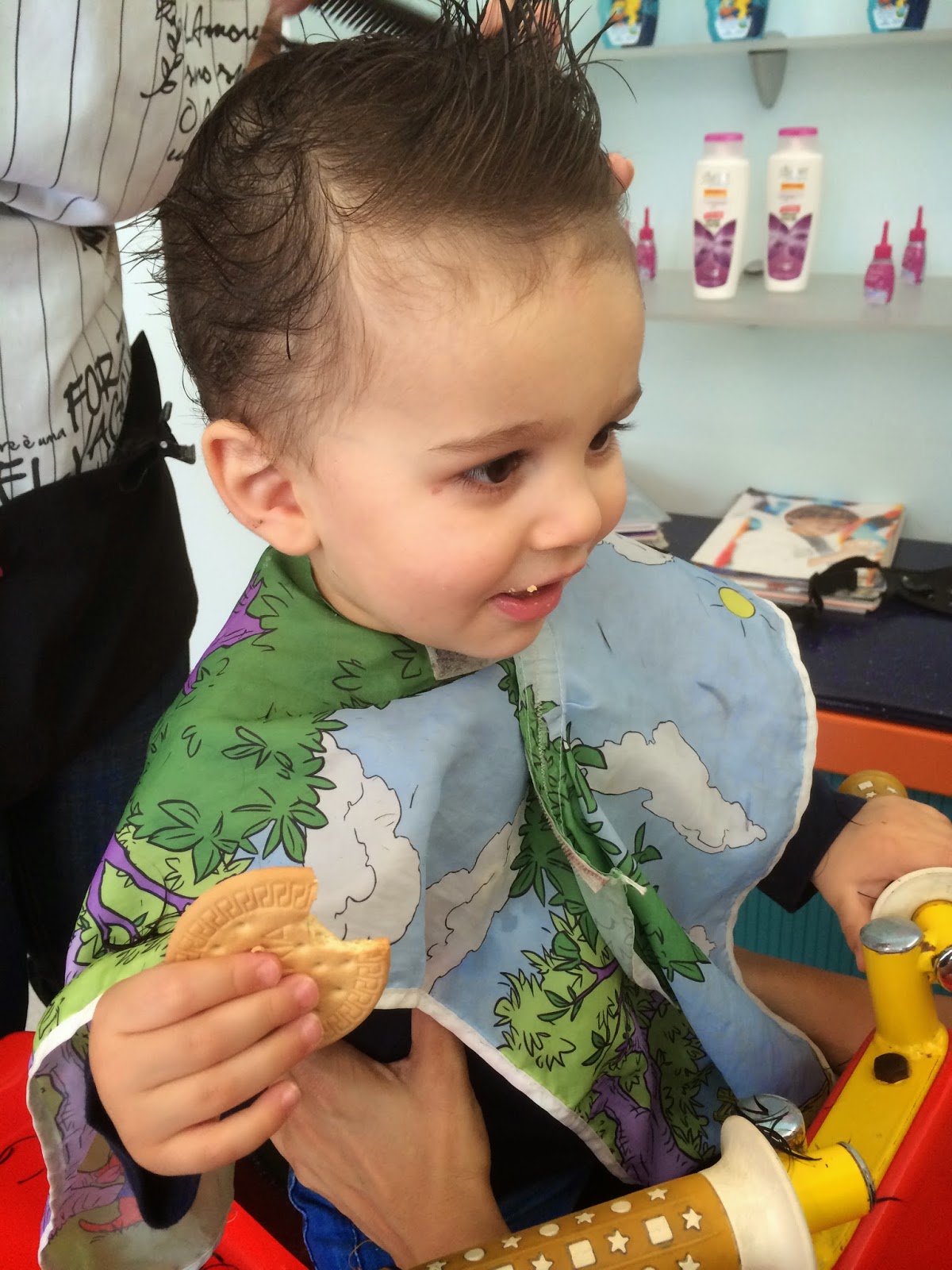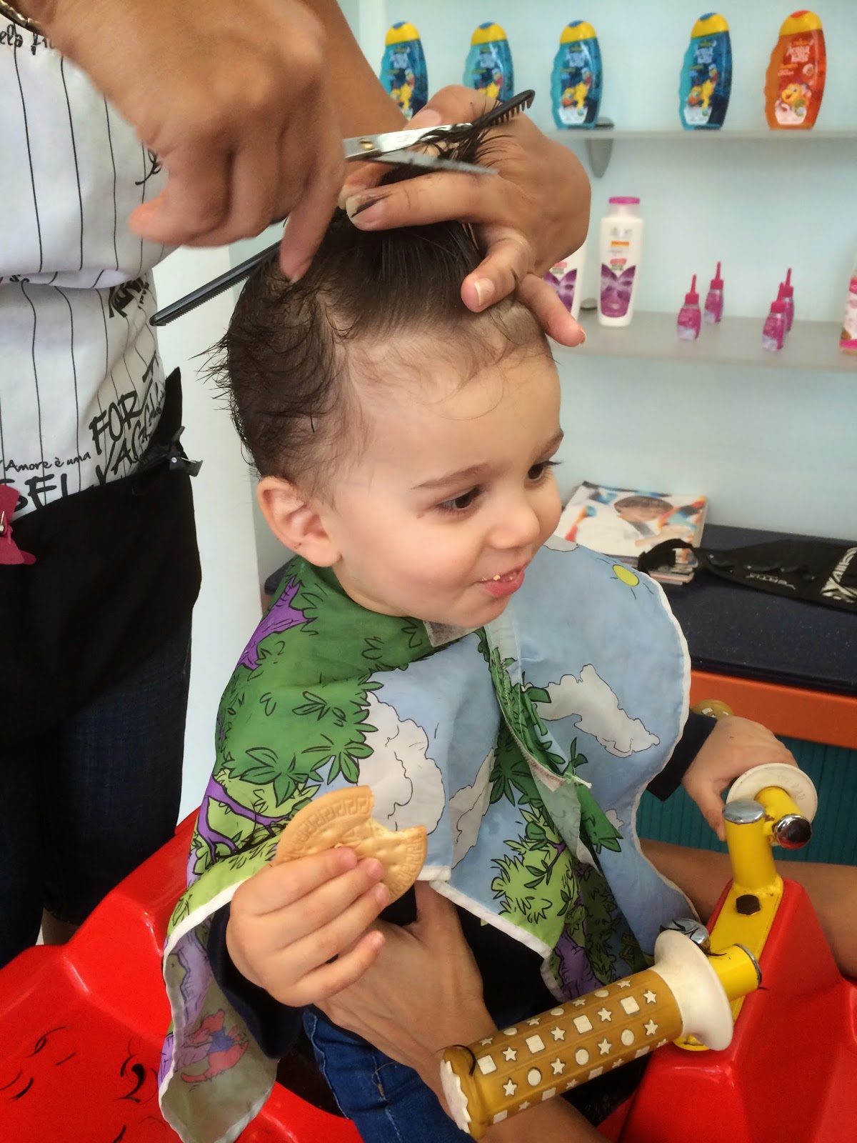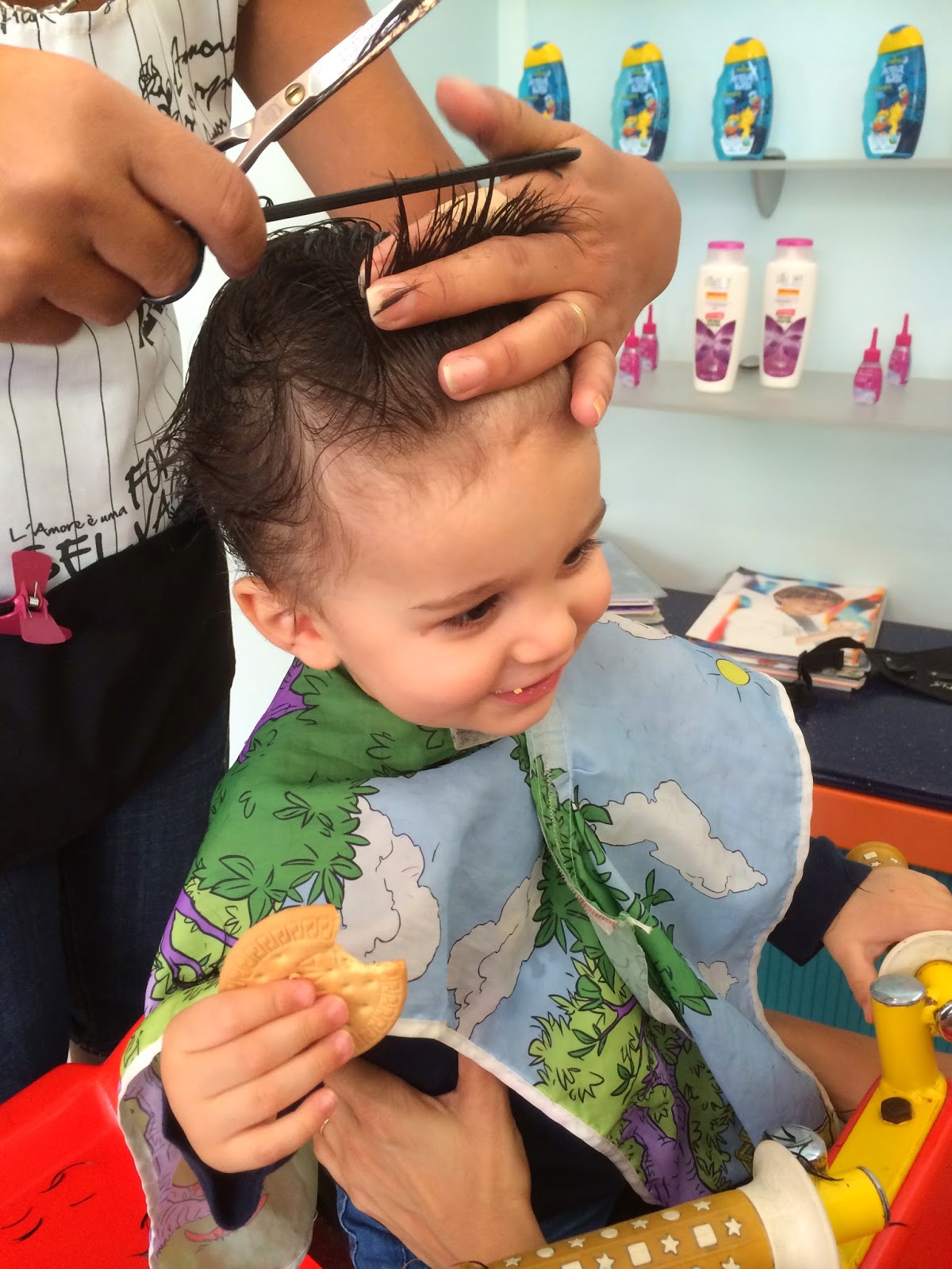 depois de umas tesouras afoitas cá em casa, as quais mereceram comentários pouco abonatórios por parte do pai, e um pouco contra minha vontade, porque me parece estúpido pagar para isto, lá fomos cortar o cabelo ao bezerro a um cabeleireiro especializado em crianças.